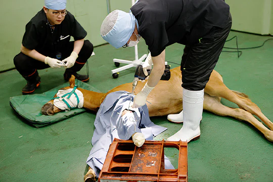 牧場で往診をしてくれている獣医師の先生方による診察の結果、二次診療が必要とされる大動物(牛、馬)に対して治療を行っています。