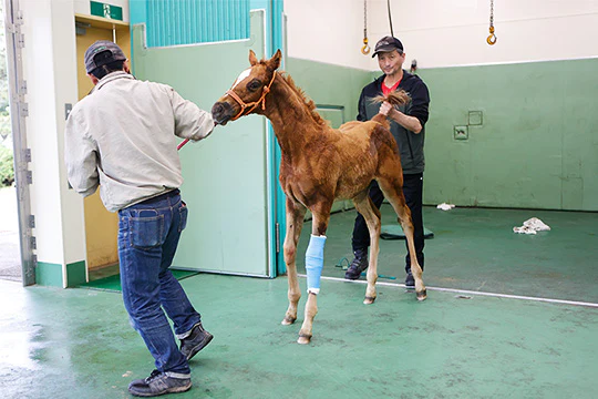 成長期整形外科疾患Developmental Orthopedic Disease (DOD) の一つである肢軸異常Angular Limb Deformity(ALD)を発症している子馬に対し、これを矯正する手術を実施。①歩様検査で左前肢がO脚状に曲がっているのを確認、②麻酔→成長を抑制したい側の成長版に、③裸子を挿入して、④麻酔が覚めたら起立を補助して終了。裸子は肢が真っ直ぐに伸びたら抜去します。このような肢軸異常は将来的な競走能力に悪影響を及ぼす可能性があるため、骨の成長板が残っているうちに矯正されるのが一般的です。
